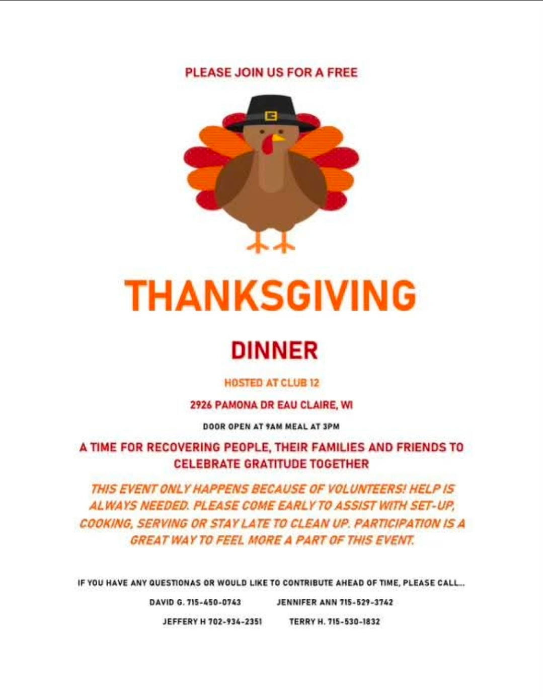 - Nov 27th 2025 : Club 12 Thanksgiving Dinner (Eau Claire)