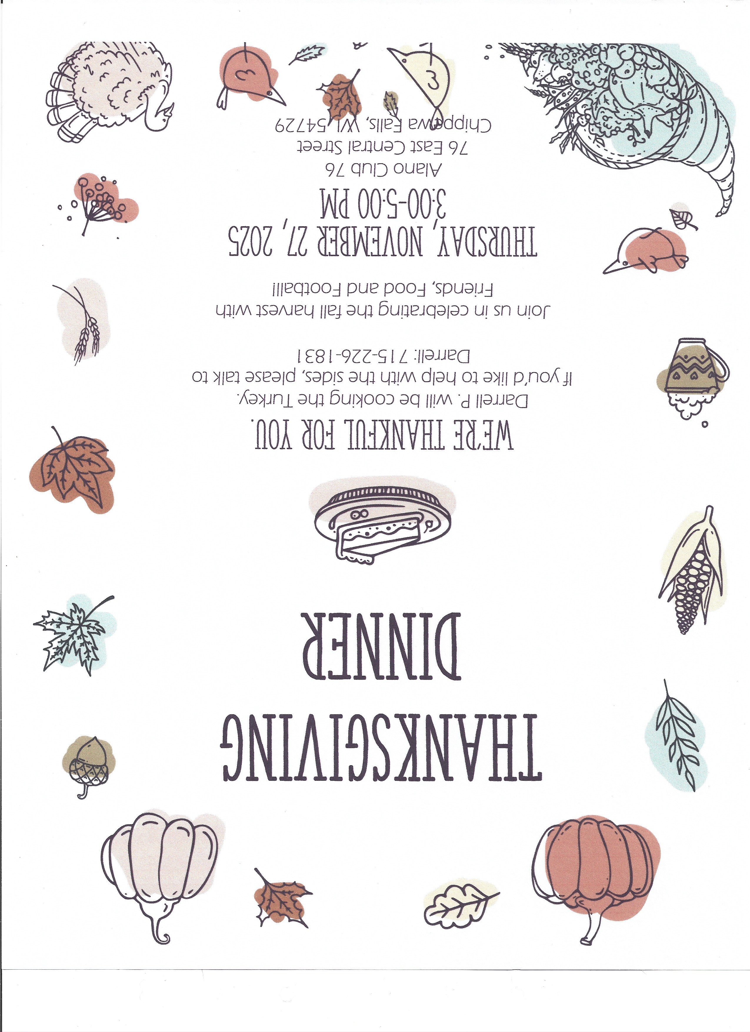 - Nov 27th 2025 : Club 76 Thanksgiving Dinner (Chippewa Falls)