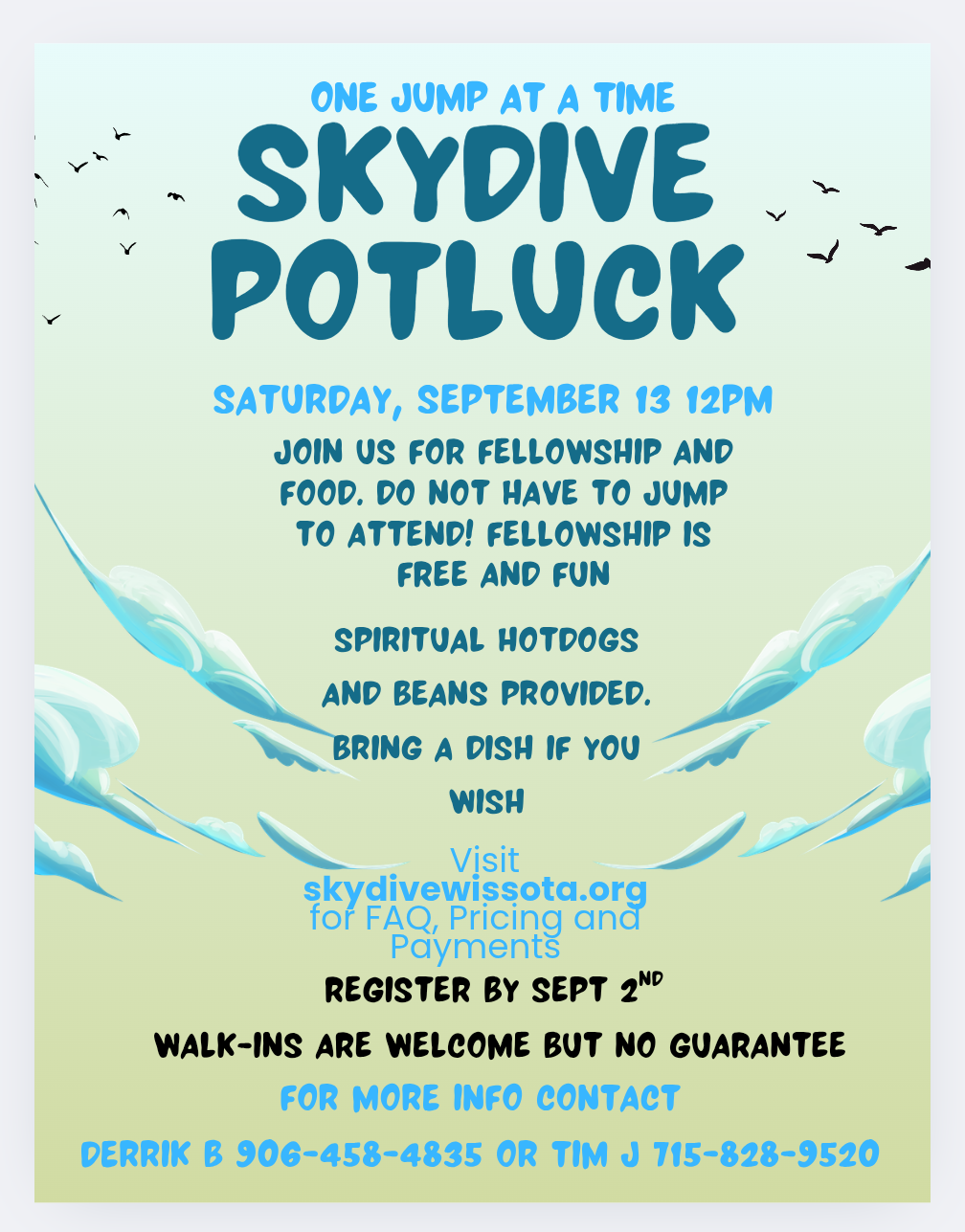 - Sep 13th 2025 : Skydive Potluck (Eau Claire)